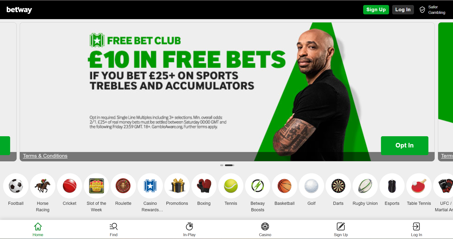 Among the finest betting sites not on GamStop, Betway distinguishes itself through an exceptionally broad selection of sports markets and odds, spanning football, horse racing, tennis, cricket, basketball, esports, and beyond. Major events such as the Premier League and Grand National attract deep market coverage, with hundreds of wagering possibilities ranging from straightforward match results to granular player proposition bets. Standout features encompass Bet Builders, cash out availability across numerous markets, accumulator enhancements, and the Free Bet Club — a loyalty programme rewarding regular users with weekly free bets upon placing qualifying multiple wagers. New UK customers are typically greeted with a matched free bet as part of the welcome promotion.