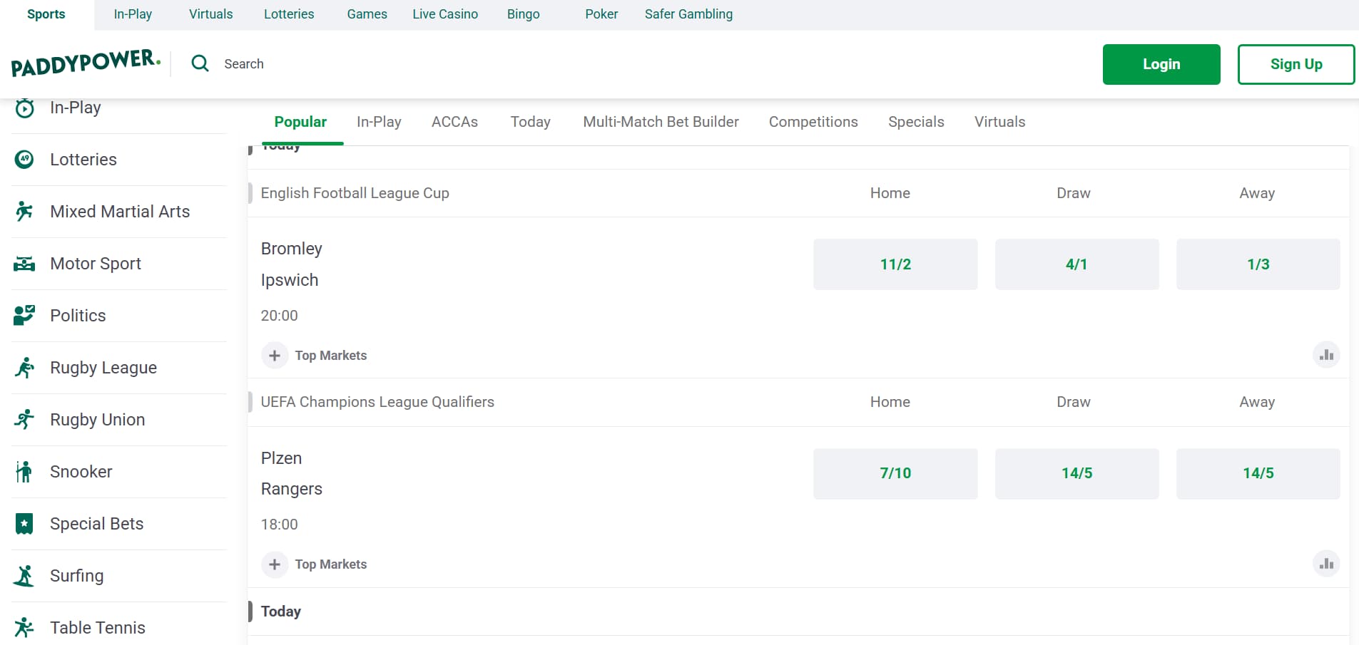 Paddy Power delivers one of the widest sportsbook selections for UK bettors, featuring strong coverage of football and horse racing alongside more than 30 additional sports such as tennis, golf and darts. Major leagues and events benefit from impressive market depth throughout the platform, while tools like Bet Builder, Cash Out and boosted accumulator bonuses allow you to tailor wagers and increase potential returns.