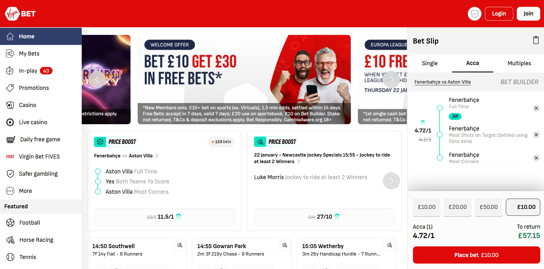 Virgin Bet delivers a dependable selection of sports markets and odds, with notably strong football and horse racing coverage that resonates well with UK punters, encompassing competitive pricing both pre‑match and in‑play. The platform features live betting supported by real-time statistics alongside live streaming on chosen races and fixtures, while tools such as Cash Out and Bet Builder allow you to personalise wagers and control exposure mid-event — particularly useful when wagering on betting sites not on GamStop.